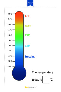 Materiał zawiera kolorowy termometr, zadanie polega na obserwacji pogody i zaznaczaniu spinaczem ...