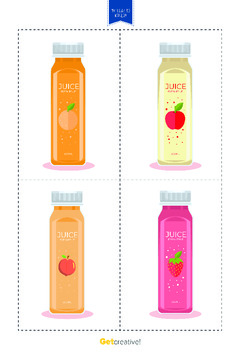 Karty obrazkowe przedstawiają butelki z sokami, posłużą do nauki nazw owoców.
