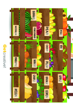 Plakat przedstawia owocowy stragan, owoce mają przypisane nazwy w języku angielskim