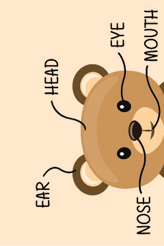 Plakat przedstawia misia z zaznaczonymi częściami ciała.