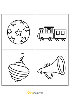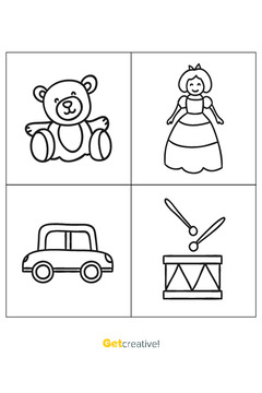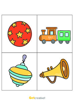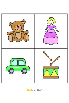 Materiał zawiera kolorowe karty przedstawiające zabawki, które można wykorzystać do zajęć ...