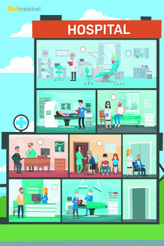 Plakat przedstawia najważniejsze pomieszczenia i gabinety w szpitalu wraz z personelem i pacjenta...
