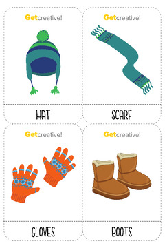 Flashcards przedstawiają ubrania zimowe.