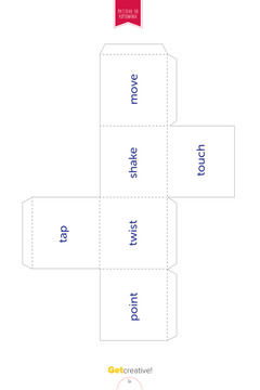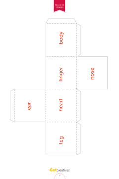 Szablon kostek do gry z nazwami części ciała i czynnościami do wykonania.
