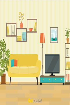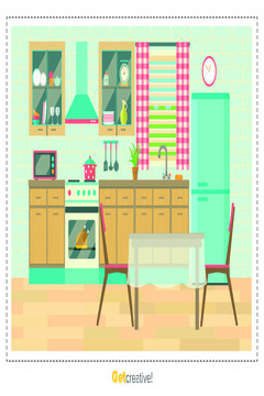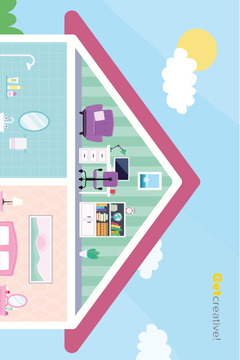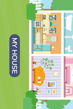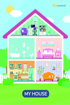 Plakat przedstawia dom i jego pomieszczenia takie jak: łazienka, kuchnia, sypialnia, pokój...