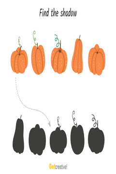 Karta pracy z wizerunkami halloweenowych dyń, zadanie polega na dopasowaniu dyni do kształtu jej ...