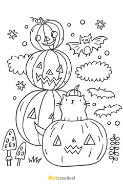 Kolorowanka przedstawia – wizerunki dyń oraz nietoperzy.