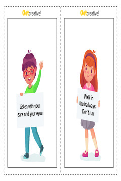 Materiał zawiera karty obrazkowe z zasadami zachowania w klasie i podczas spaceru.