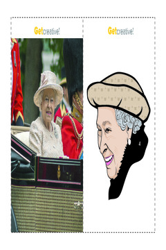 Materiał zawiera karty obrazkowe przedstawiające Królową Elżbietę II.