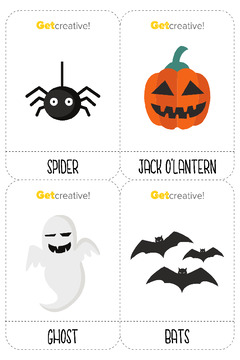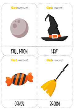 Karty obrazkowe przedstawiają ilustracje nawiązujące do Halloween