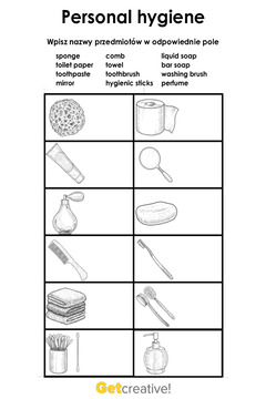 Karta pracy do powtórzenia nazw przedmiotów związanych z higieną osobistą. Należy w...