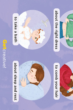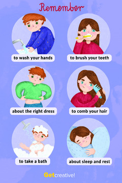 Plakat przedstawia codzienne czynności związane z higieną.